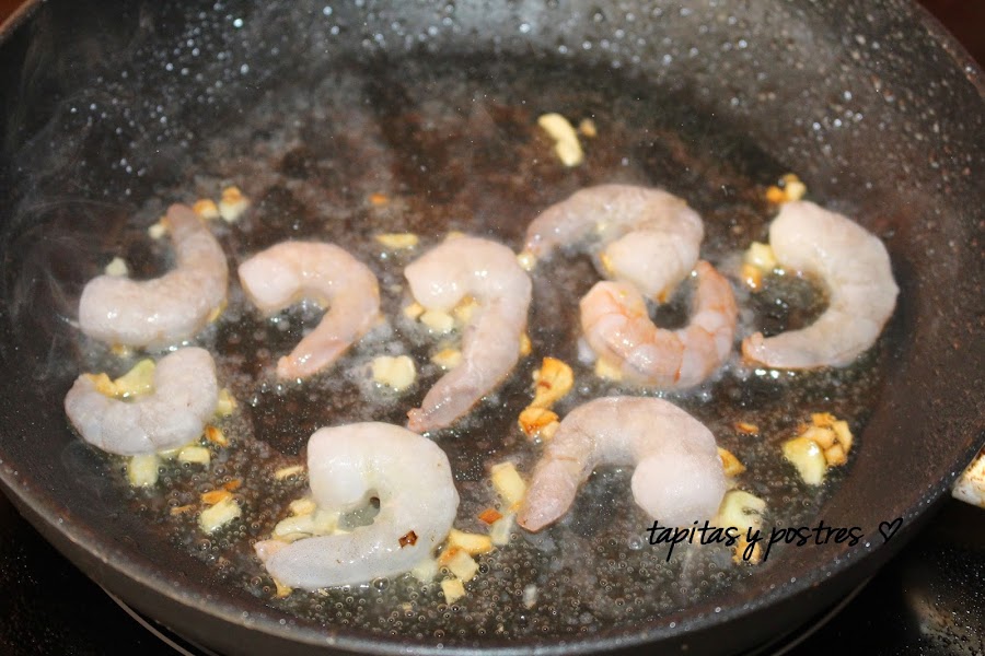 Añadimos las gambas peladas y dejamos que se hagan un poco.