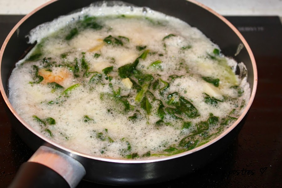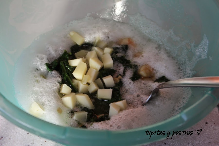 Echamos en las claras las espinacas, el ajo y las gambas. Salamos y añadimos el queso curado en dados.