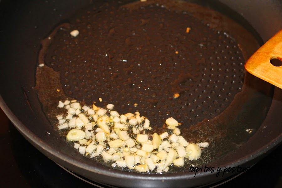 En una sartén ponemos un fondo de aceite de oliva y freímos un ajito en dados.