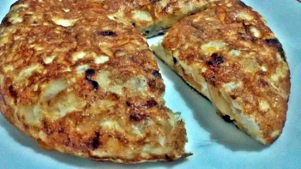 Lo mezclamos y echamos en la sartén, dejamos que se cuaje por un lado y cuando veamos que ya está porque se despegan fácilmente los bordes, le damos la vuelta con ayuda de un plato y dejamos que se haga por el otro.