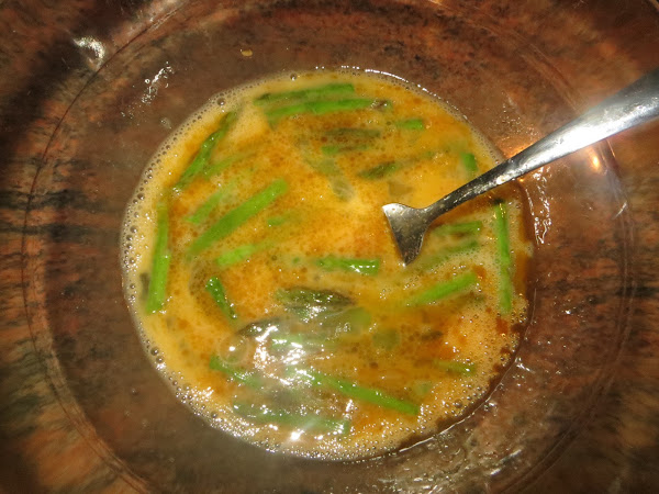 Lo primero que hacemos es cortar los espárragos trigueros, le quitamos la parte más dura, los lavamos y los cortamos en tres o cuatro trozos. Ahora echamos un chorro de aceite en la sartén, picamos los dientes de ajo y los añadimos. Cuando comiencen a estar dorados añadimos los espárragos y salpimentamos, los dejamos cinco minutos hasta que estén un poco cocinados, retiramos la sartén del fuego y añadimos la cucharadita de pimentón.