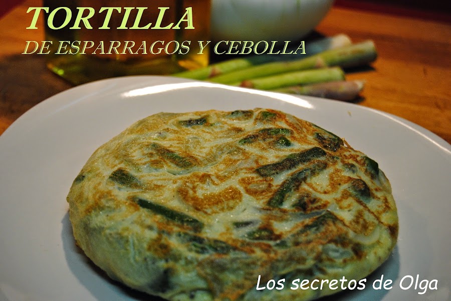 En un plato batimos los huevos. Mezclamos con la cebolla y los espárragos y vertemos en una sartén antiadherente a la que habremos añadido unas gotas de aceite de oliva.
