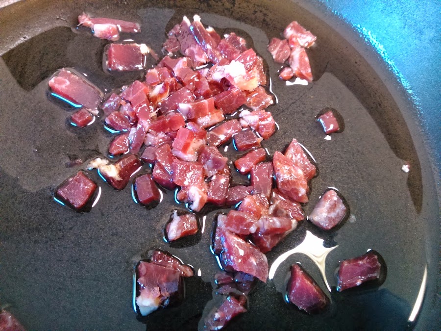 Picamos el jamón y rehogamos en un poco de aceite