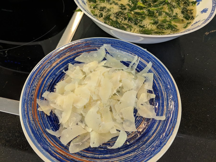 Con ayuda de un pela verduras cortamos el queso en lascas.
