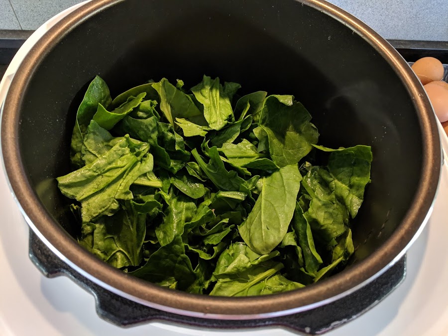 Pimienta negra recién molidaLimpiamos las hojas de espinacas. Si son muy grandes (como es mi caso) las troceamos. Escurrimos muy bien. Seleccionamos menú freir, echamos un chorro de aceite y los ajos. Cuando se empiecen a dorar incorporamos las espinacas