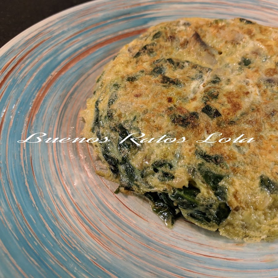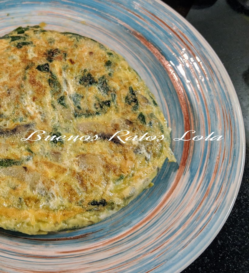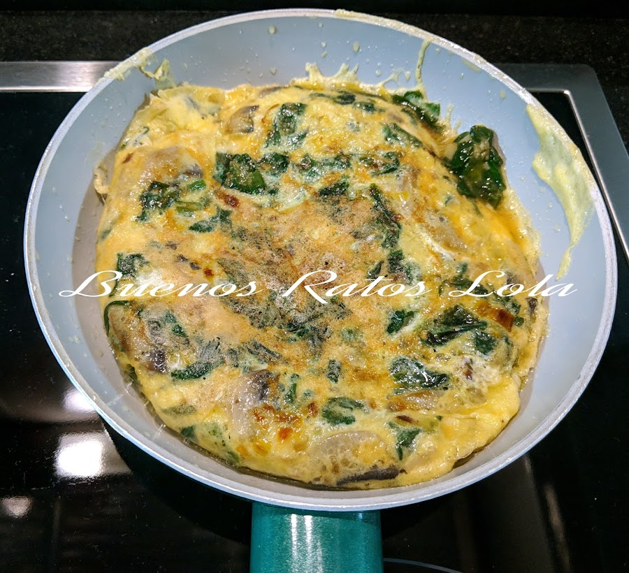 Una sencilla tortilla, fácil y rápida de preparar y que me hace cerrar los ojos cuando la pruebo... Cuando vayas a la frutería escoge los productos más frescos y, en cuanto llegues a casa la preparas, no esperes a que se queden lacias las hojas de espinacas y marrones los champiñones