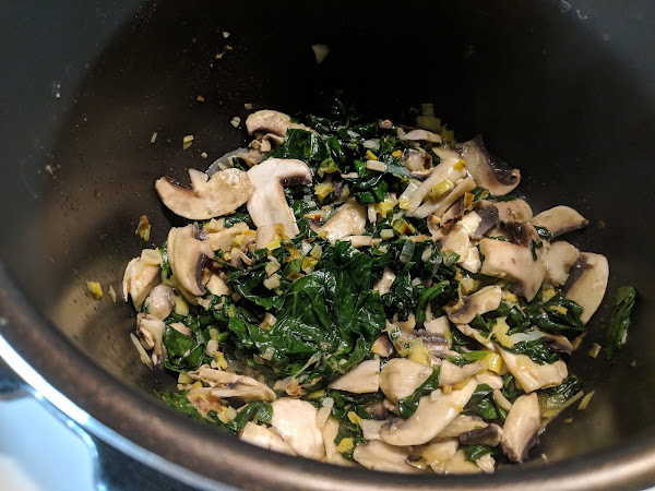 Lava las espinacas y escúrrelas muy bien. Trocea y, cuando veas que empiezan a dorarse cebolla y puerro, añade a la cubeta. Saltea dos o tres minutos desde que bajan de volumen (al principio parece que se salen jajajaja)