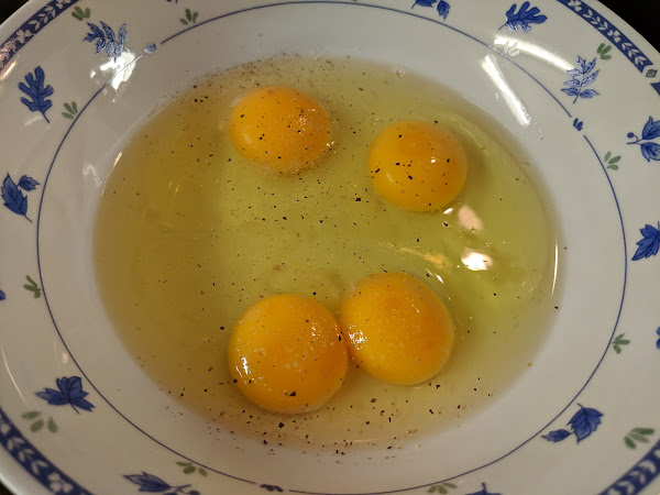 Casca los huevos y salpimenta, bate pero no mucho, y añade las verduras. Con las cantidades que ves en las fotos he preparado dos tortillas pequeñas. Si lo prefieres haz solo una. En este último caso puedes cuajarla en la olla, en menú guiso y con cabezal simultáneamente a 180 grados; los minutos en función de lo hecha que te guste