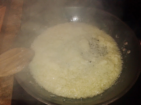 Picamos el ajo y la cebolla bien pequeñita y la ponemos a pochar en una sartén con un poco de aceite y les echamos un poco de sal.