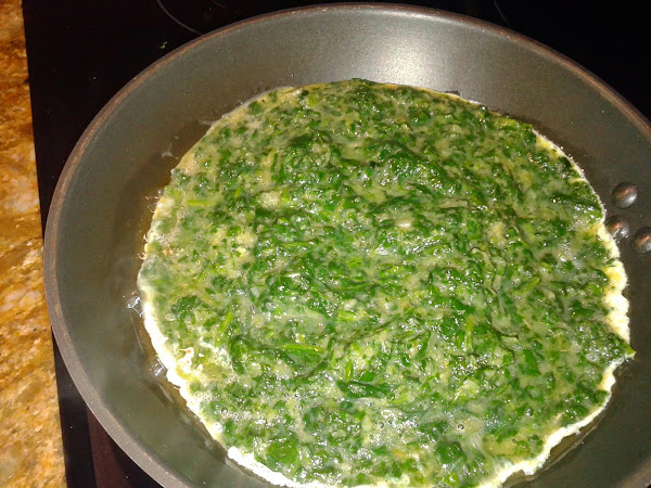 Ponemos un poquito de aceite en una sartén y cuando esté bien caliente añadimos el huevo batido con las espinacas.