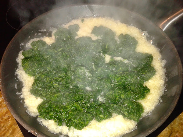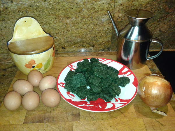 1 paquete de espinacas congeladas, 6 huevos, 1 cebolla grande, 2 dientes de ajo,aceite y sal.