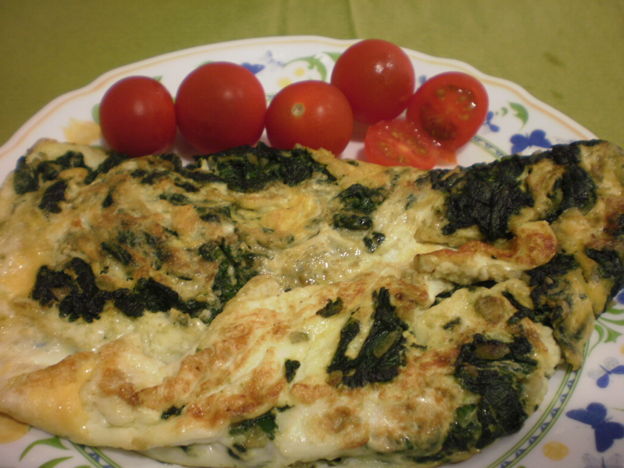 Hace unos dias preparó un pastel de espinacas, huevos y tomates cherries, no he seguido sus pasos, pero acordándome de ella hice ésta tortilla con los mismos ingredientes.......