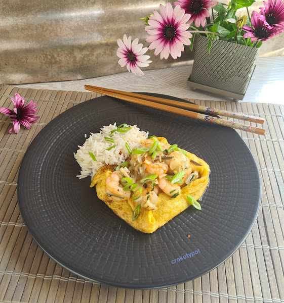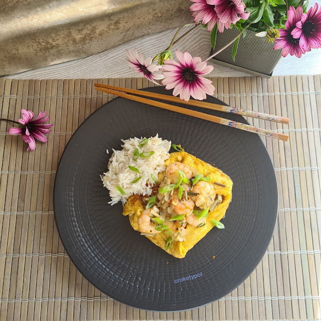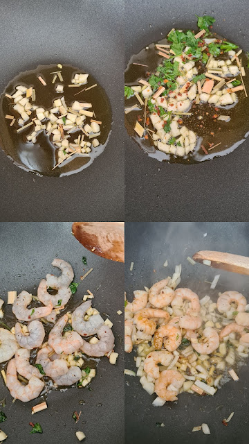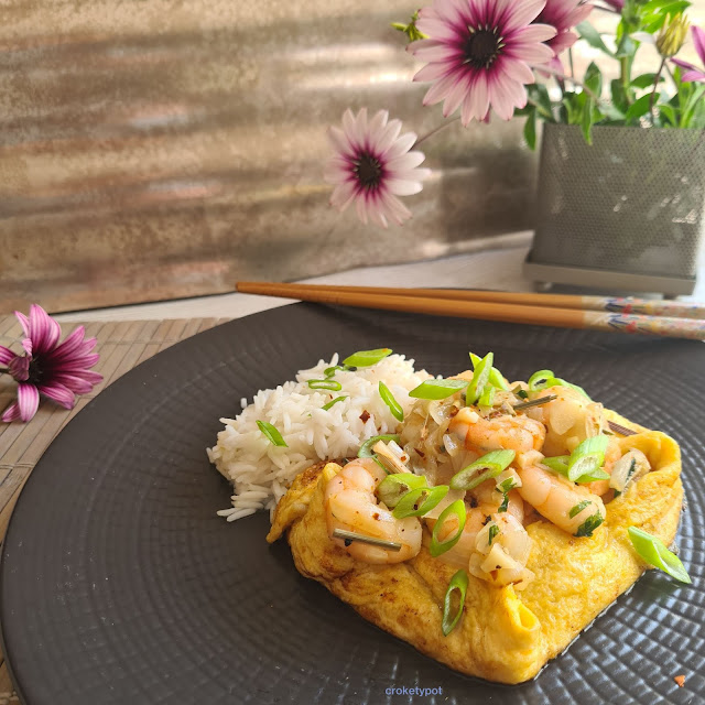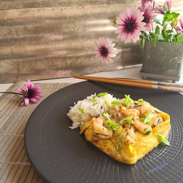 INGREDIENTES: 2 huevos, 100 gr langostinos, 2 dientes de ajo picados, hierba limón, cilantro picado fino o perejil, guindilla roja picada, 1 cebolleta pequeña picada, pimienta negra, 2 cucharadas de salsa de pescado, 1 cucharadita de azúcar moreno, 1 cucharada de agua, cebolleta verde en juliana para terminar , 2 cucharadas de aceite de oliva Aove. Arroz basmati para acompañar.