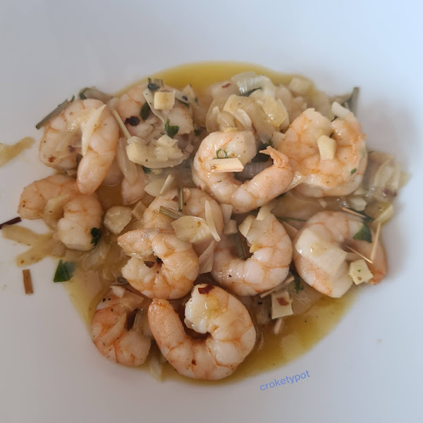 En el wok ponemos el aceite de oliva, los ajos y la hierba limón, dejamos freír un poco, añadimos el cilantro y la guindilla, ponemos los langostinos, salteamos y cuando cambian de color agregamos la cebolleta partida, la pimienta, 1 cucharada de salsa de pescado y el azúcar