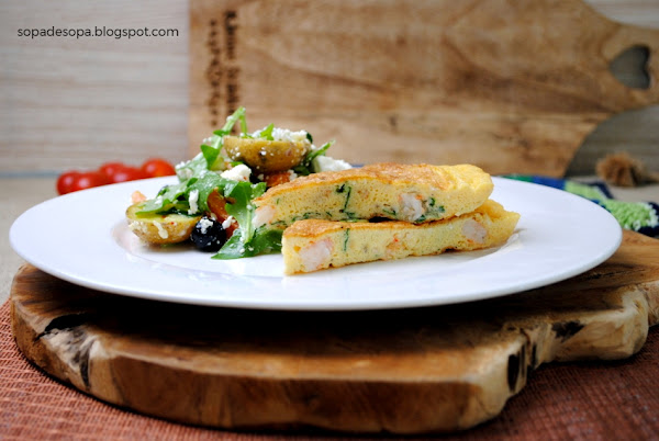 Esta tortilla es sencilla como os he dicho antes. Simplemente lleva unas gambas, un toque de sabor que le aporta el queso parmesano y el perejil. Y es que no necesita nada más.