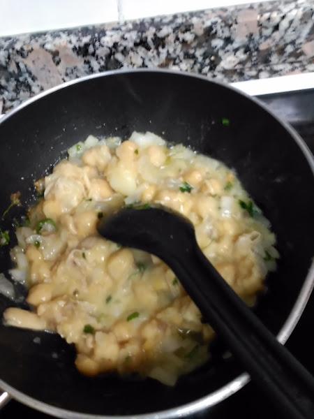 1.- Picar la cebolla y el perejil y pocharlos en la sarten . Añadir los garbanzos y sofreeir hasta que queden "sequitos".