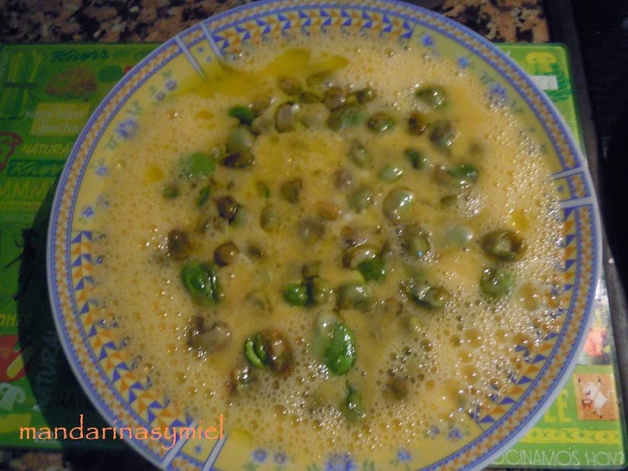 Pon un poquito del aceite en la sartén para hacer la tortilla y echa toda la mezcla de huevos y habas.