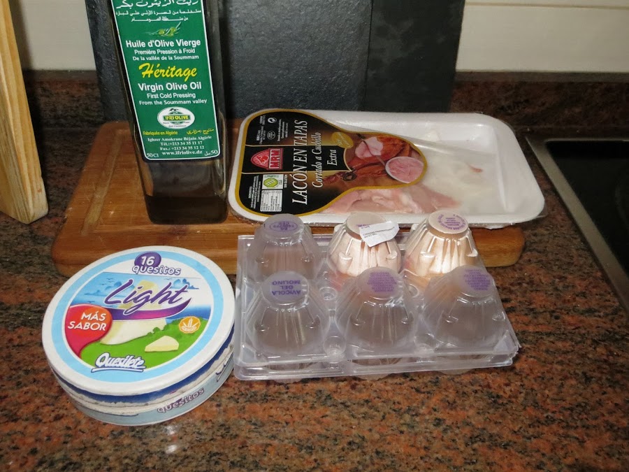 Batimos los huevos, si queréis que la tortilla sea más ligera quitarle las yemas, eso sí os quedará más blanca. Una vez que tenéis batidos los huevos, le echáis sal, hay gente que le añade leche, pero yo no lo hago. Cortáis el lacón y los quesitos en trozos pequeños.