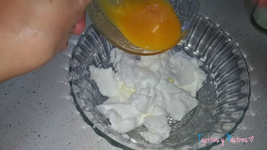 Echamos las claras en un recipiente y las mezclamos suavemente con las yemas.
