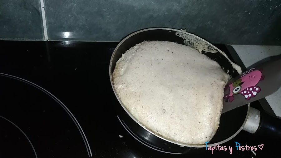 Cocinamos unos minutos y cuando al levantarla con una espátula veamos que está lista por debajo, damos la vuelta con cuidado y seguimos cocinando.