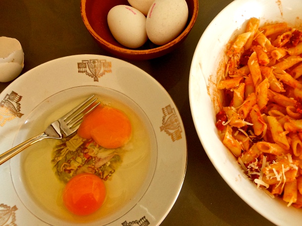 A continuación vierte los huevos batidos sobre el bol de los macarrones y remueve bien usando una cuchara de madera.