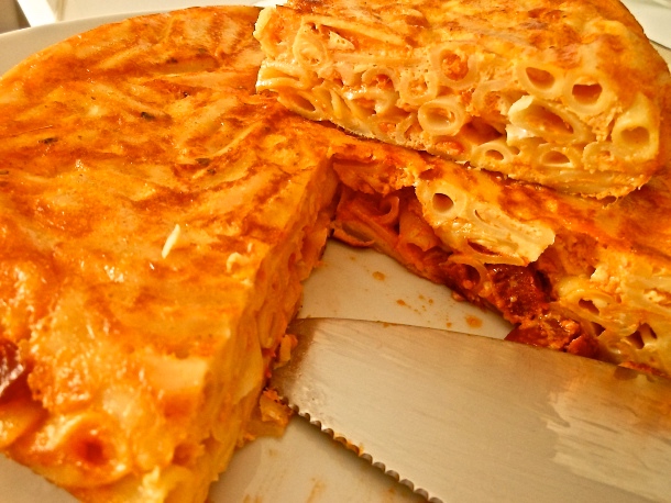 Cuando el aceite esté caliente vierte la mezcla de macarrones en la sartén y cuájala por un lado.