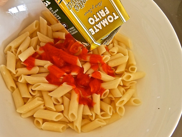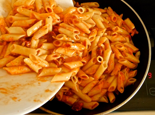 Tras esto añade a los macarrones, el chorizo, el queso rallado y las cuatro cucharadas de tomate frito. Remueve bien hasta que todo quede bien mezclado.