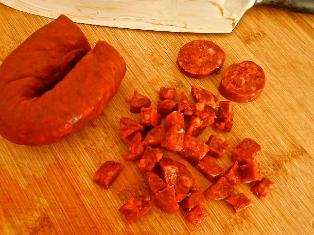 Seguidamente corta el chorizo, primero en rodajas y después en trocitos.