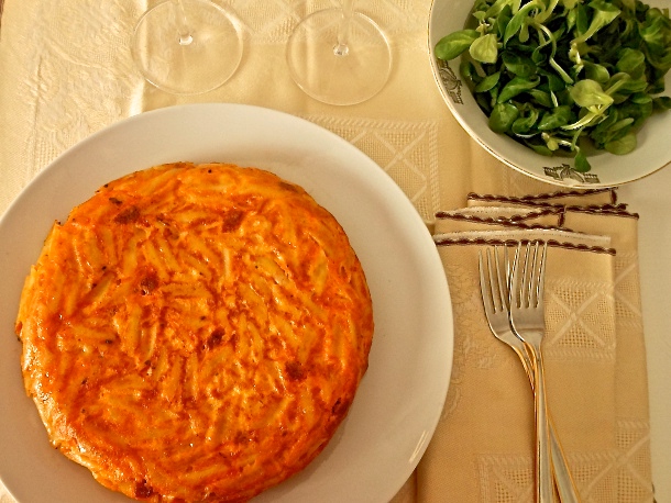 Cuando la tortilla esté hecha por un lado dale la vuelta usando un plato llano o similar y deja que la tortilla se cuaje por el otro lado.