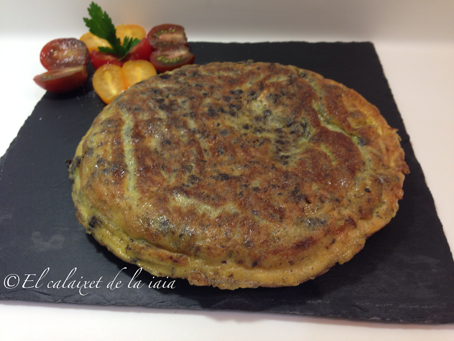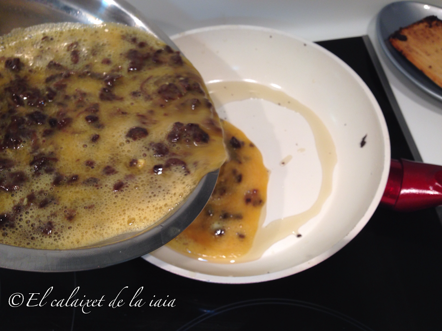 y la volcaremos en la sartén con el aceite que ha quedado de freir la morcilla, dejaremos cuajar, voltearemos con un vuelca tortilla y acabaremos de hacer. No pongo tiempos porque todo depende de como nos guste de cuajada la tortilla.