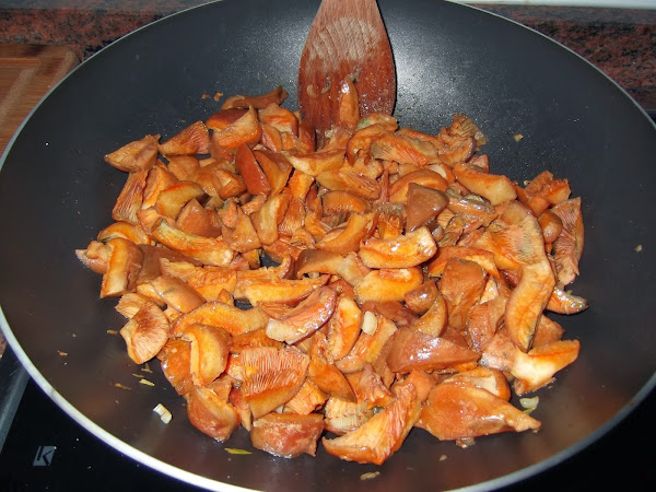 Lo primero que vamos a realizar son las setas. Se cocinan como hace unas semanas os comenté que se elaboraban las de cardo. Ponemos en una sartén un poco de aceite, cortamos un diente de ajo en trocitos pequeños y cuando está dorado echamos las setas y les comenzamos a dar vueltas hasta que se cocinen.
