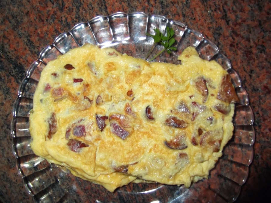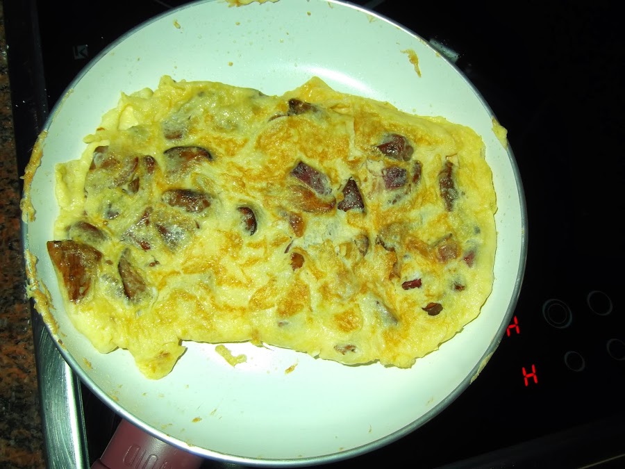 El siguiente paso es echar un poco de aceite en una sartén (también podéis emplear el de las setas y dara más gusto al plato) y echar los huevos con el resto de los ingredientes. La dejamos que se dore un poco y la vamos doblando y le damos un par de vueltas para que se haga por todos los lados y ya está lista para comer.