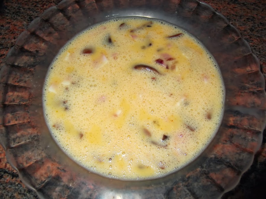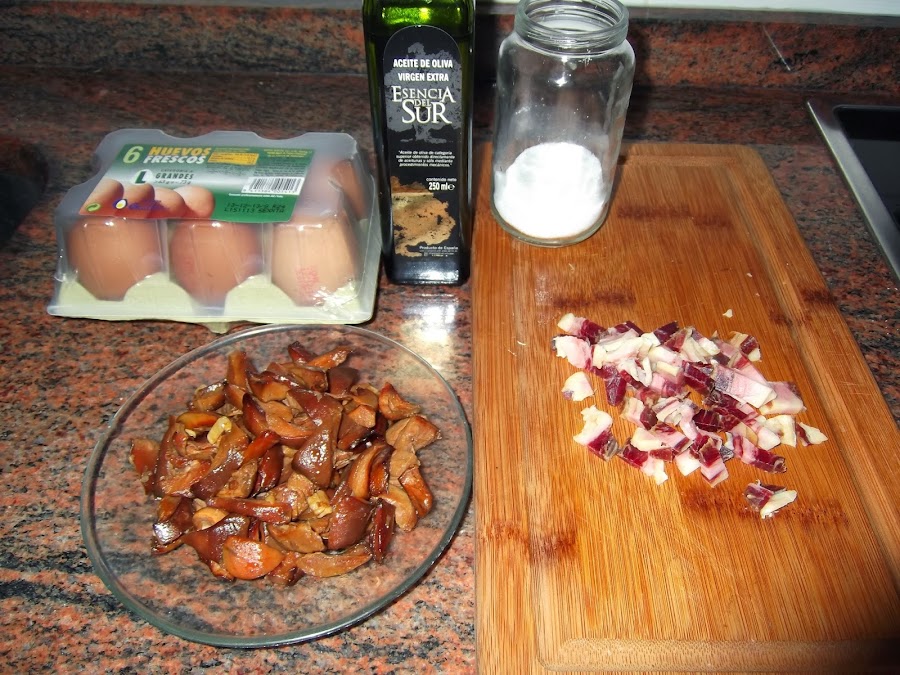 Una vez que tenemos cocinadas las setas, batimos los dos huevos y cortamos el jamón en tacos pequeños, se echan en el huevo las setas y el jamón. Si queréis podéis añadirle sal, pero daros cuenta que el jamón ya es suficientemente salado. También podéis freír el jamón con antelación, aunque personalmente a mí me gusta echarlo crudo.