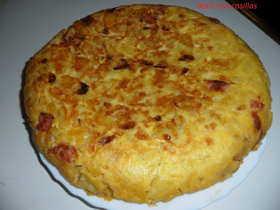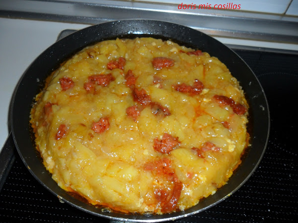Batimos los huevos mejor a temperatura ambiente y agregamos las patatas con el chorizo bien escurridos de aceite.
