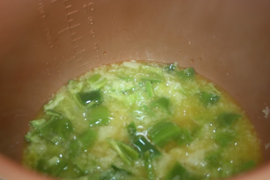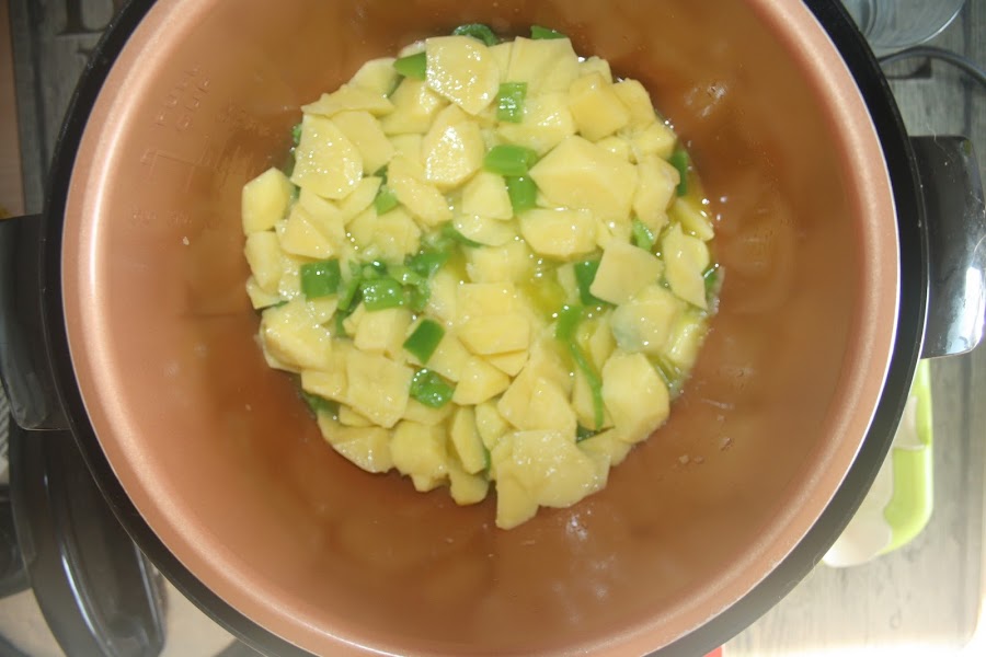 En la cubeta de la olla añadimos bien de aceite hasta cubrir la base por completo, programamos menú sofreir a 130º y cuando notemos que está caliente añadimos la cebolla. Dejamos que se haga sola un par de minutos antes de añadir el pimiento verde.