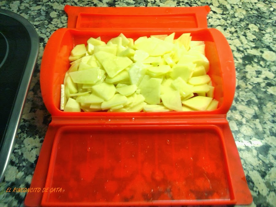 Introducimos en le microondas a máxima potencia 5 minutos, pasado este tiempo, sacaremos con cuidado el estuche del microondas y lo abriremos (ojo que sale vapor), removemos las patatas y volvemos a introducir otros 5 minutos. Así hasta que veamos que las patatas estén cocidas, normalmente serán unos 10 o 12 minutos, depende del microondas y de la cantidad de patatas.
