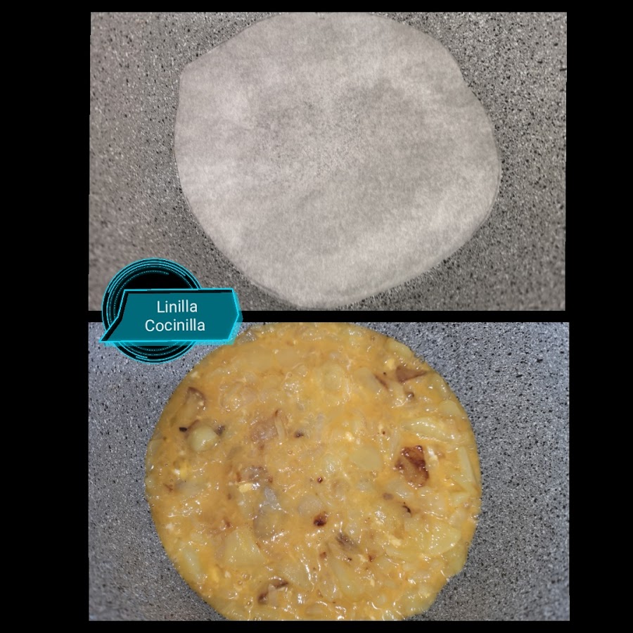 6. Para cuidar el fondo de la olla he puesto un trozo de papel vegetal (opcional). Ponemos el preparado de la tortilla en la cubeta y aplanamos con la cuchara para darle la forma.