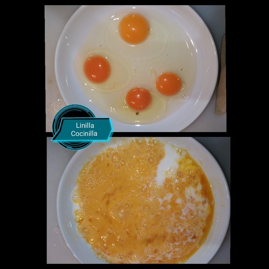 4. Mientras tanto cascamos los huevos en un bol y los batimos, agregamos la leche y un poco de sal, mezclamos bien.