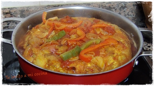 Ingredientes: patatas, 1/2 cebolla, huevos, sal, aceite, ajo, pimiento verde o rojo ( o ambos), una cucharada de pimentón, una lata de tomate natural y un vaso de agua.