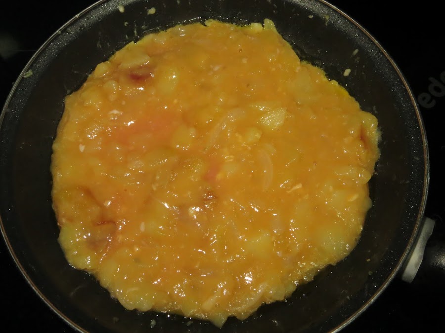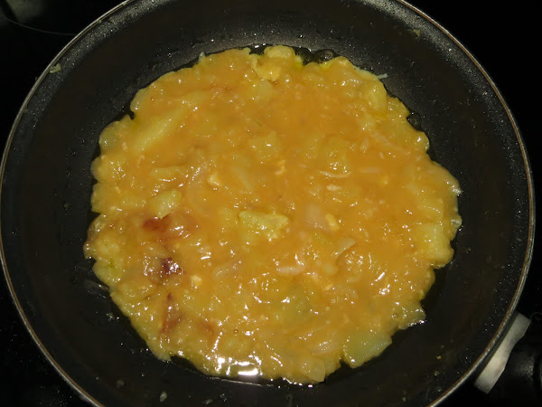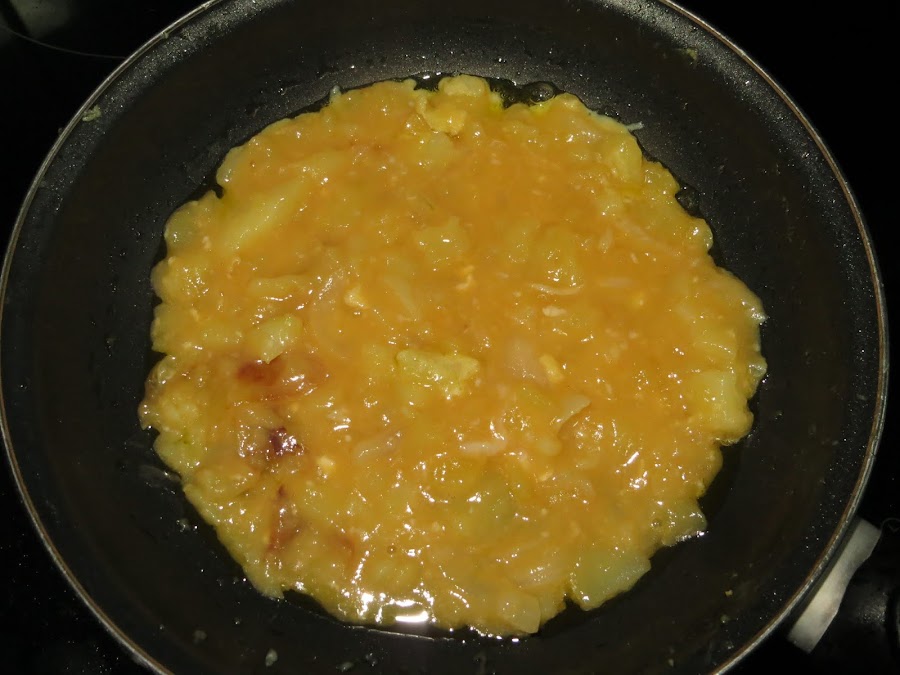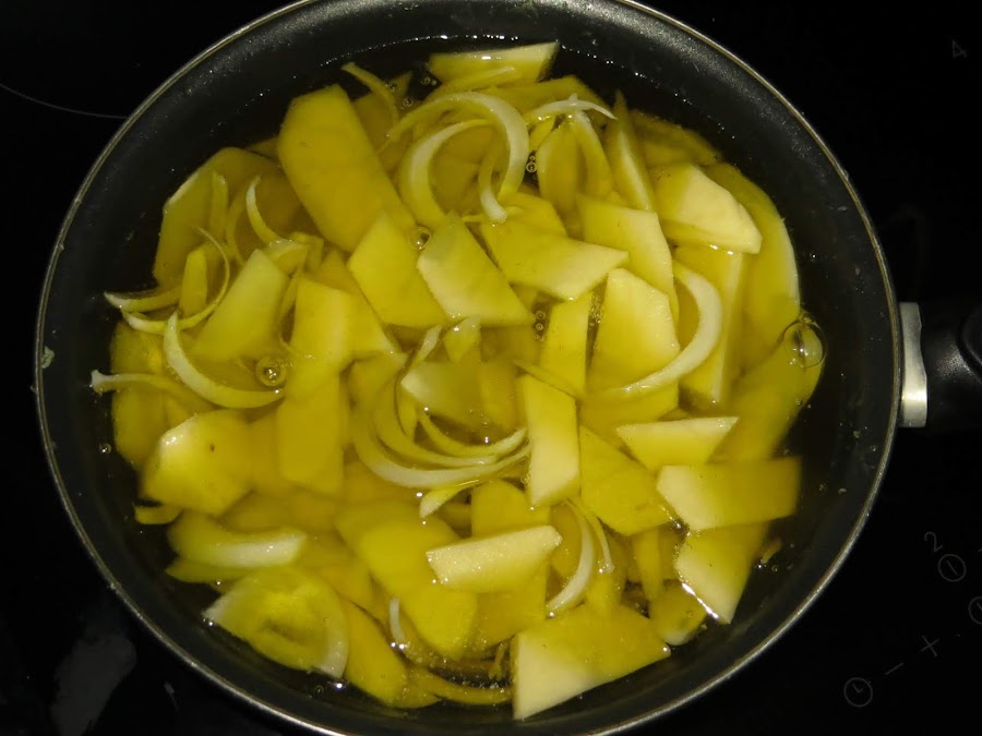 Pelamos y cortamos la cebolla en juliana. Pelamos las patatas y las cortamos en daditos o en láminas finas. Salamos. Echamos buena cantidad de aceite en la sartén y freímos las patatas con la cebolla. Cuando ya están cocinadas las partimos un poco y las vamos retirando con una rasera.