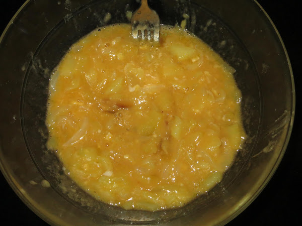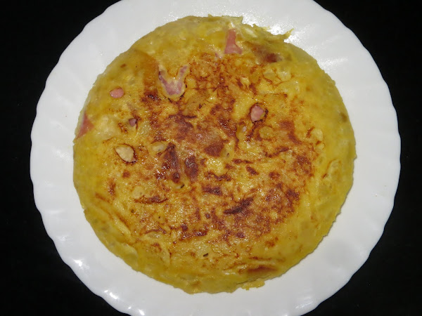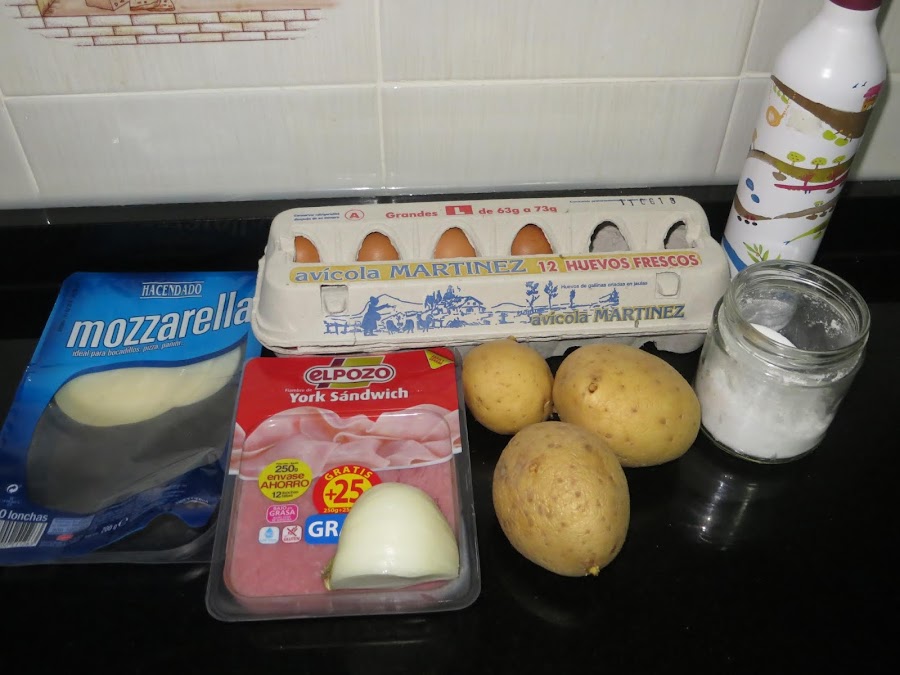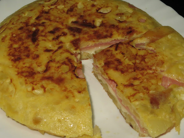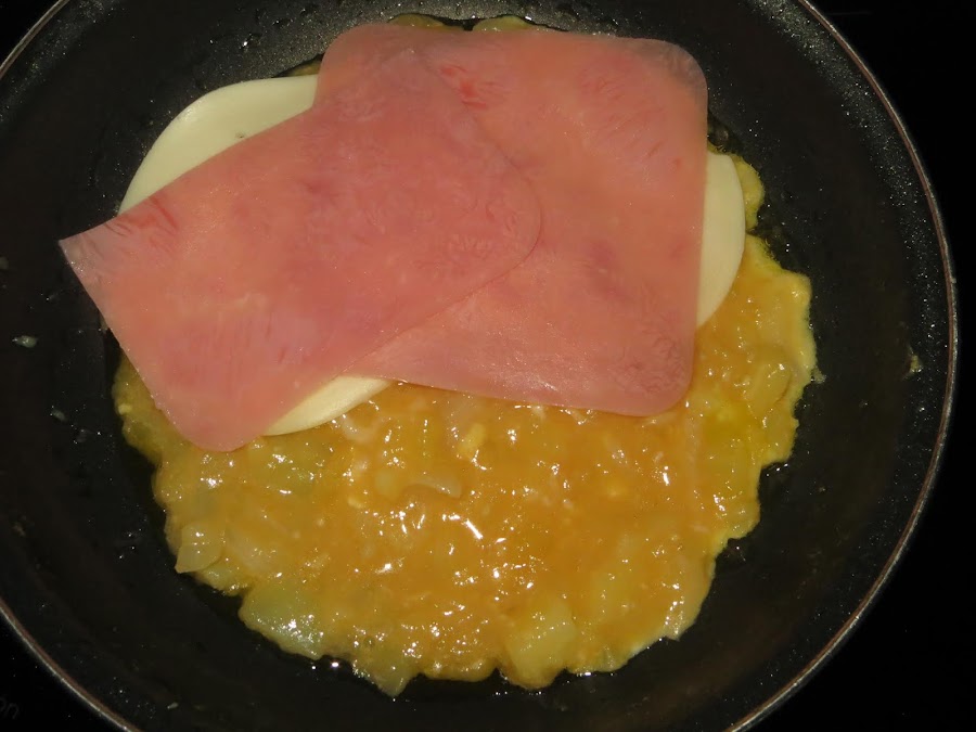 Echamos las patatas en un bol donde tendremos los huevos batidos y las dejamos ahí unos 15 minutos para que se ablanden. Ahora en una sartén antiadherente echamos un chorro de aceite de oliva y ponemos la mitad de nuestra mezcla, encima colocamos el queso y el jamón de york y echamos la otra mitad de las patatas.