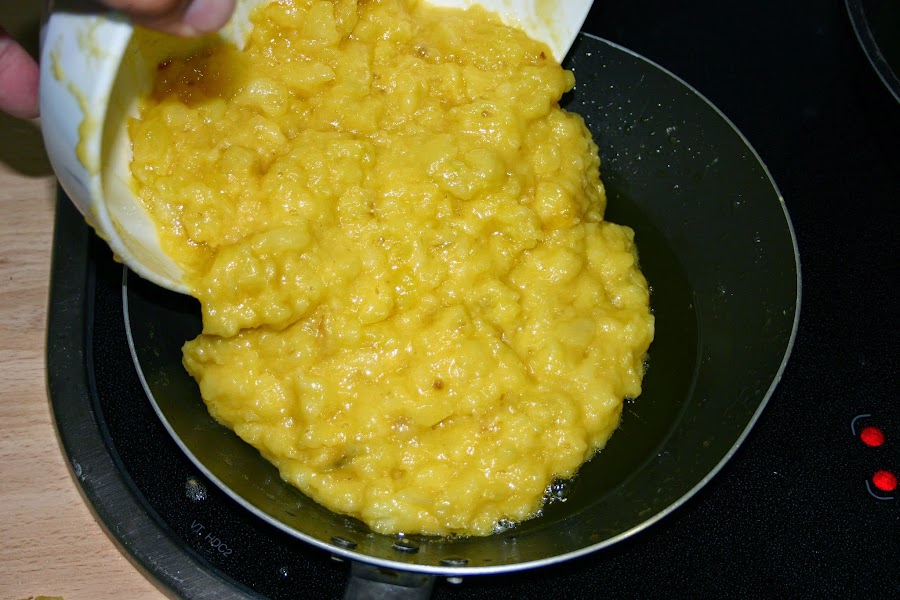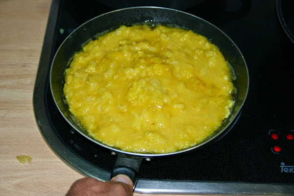 id moviendo la sarten por el mango y ahuecando un poco la mezcla con una paleta para que el huevo se vaya haciendo