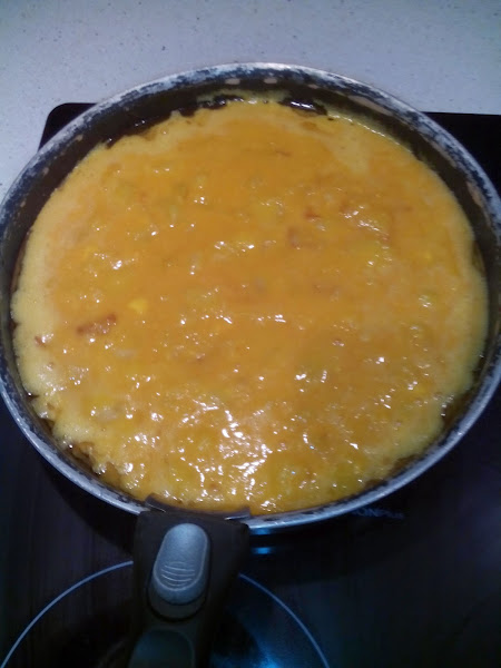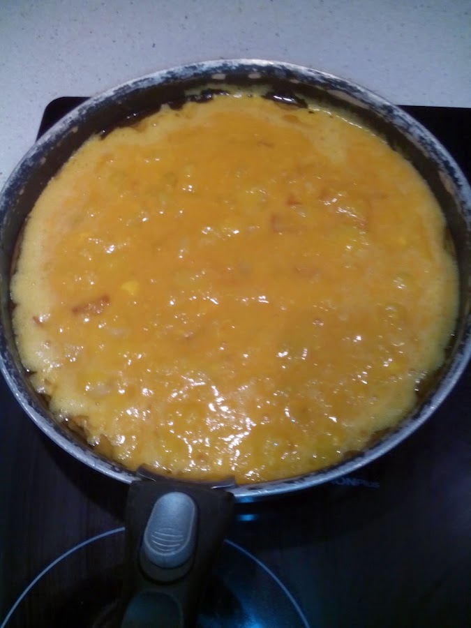 6º Poner una sartén a calentar con un poco de aceite, cuando este bien caliente echar la mezcla y estirarla bien con un tenedor. A fuego medio, dejar hacer.