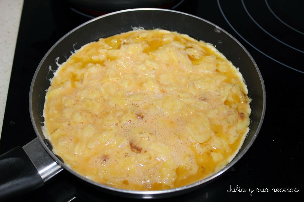 Batimos los huevos y los mezclamos con las patatas.
