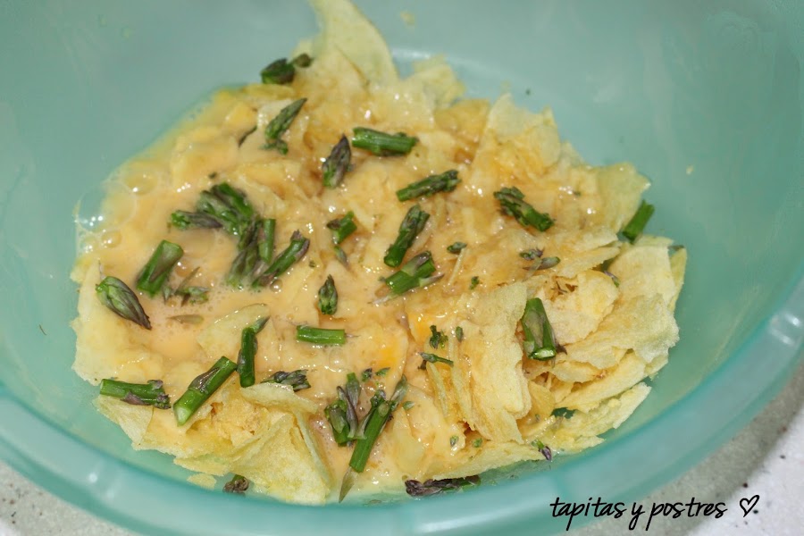 Ponemos las patatas en un bol grande y las machacamos un poco. Agregamos los huevos batidos y dejamos que hidraten las patatas, esto es muy importante, las patatas deben quedar blanditas, si creéis que es necesario añadís otro huevo más. Yo le he añadido también unas puntas de espárragos verdes .