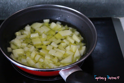 Vamos a hacer la tortilla como tengamos por costumbre. Cortamos las patatas en cuadraditos, las salamos y freímos en aceite caliente hasta que estén más o menos doradas.