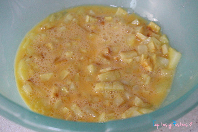 Las sacamos de la sartén, escurrimos del aceite y las mezclamos con los huevos batidos.