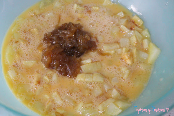 Agregamos la cebolla caramelizada al gusto, yo puse tres cucharadas bien hermosas. Mezclamos.
