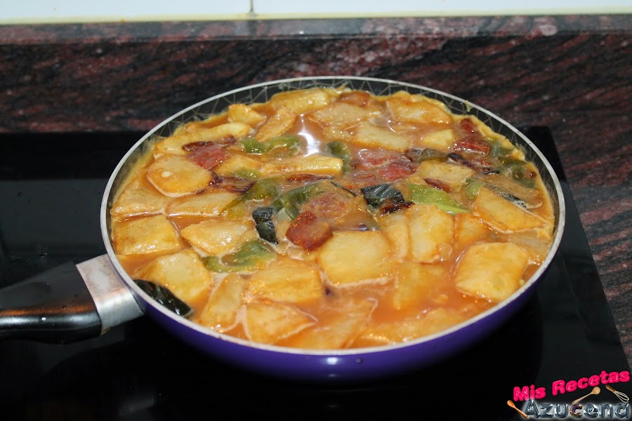 Lo mezclamos todo bien le ponemos un poco de sal y freiremos todo a una temperatura de 170gr hasta que las patatas empiecen a ponerse doradas, lo haremos en la misma sartén donde acabamos de freír los pimientos, también podemos utilizar la freidora.