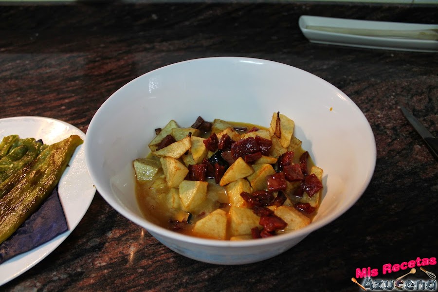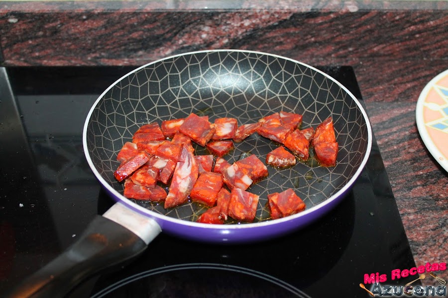 Mientras la patatas se fríen pondremos una sartén al fuego a fuego medio, cuando este caliente añadiremos un chorreón de aceite y picaremos el chorizo en cuadrados, lo ponemos en la sartén y lo freímos durante 2 minutos, una vez listos retiramos del fuego y reservamos con el aceite.